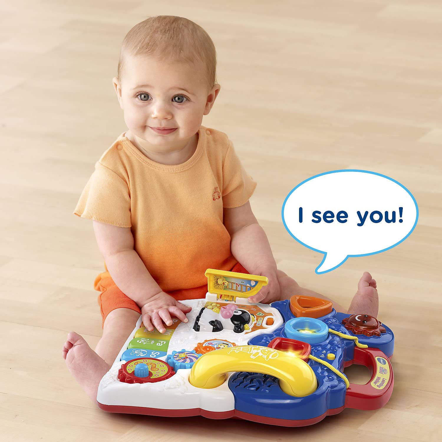 • Features 2 colorful spinning rollers, 3 shape sorters, and 3 light-up buttons that develop motor skills